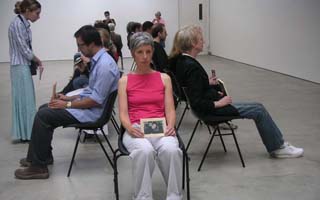 People sit holding photographs of deceased loved ones and family members.